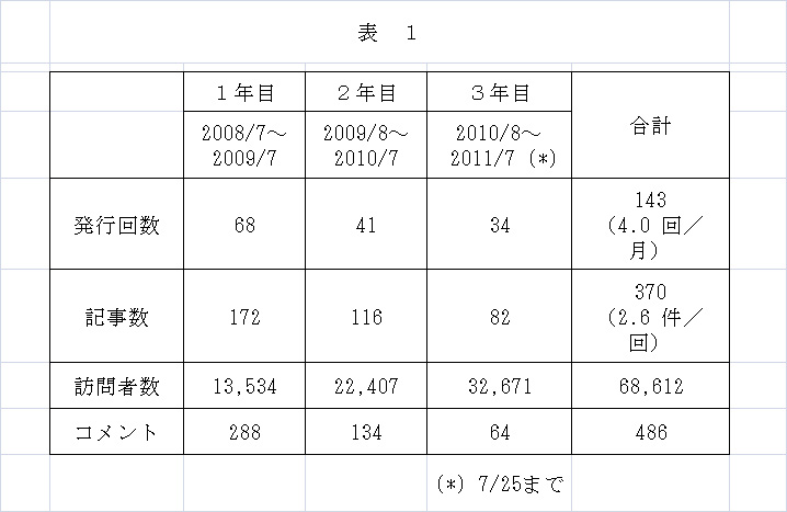 表1はスタートから3年間のデータです。これまでにブログを143回発行して370件の記事を掲載しました。訪問者の総数は6万8千人を超えました。