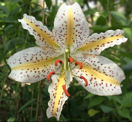 一方12,000株の「ヤマユリ」は,日本一の原生地といわれており,大きくて豪華な白い花,その強り芳香が特徴です。出かけたのは7月17日で,これもまた34°Cの炎天下でした。「ヤマユリ」はその名の通り山の斜面に群生し,花期が7月で酷暑時の山登りが必要なため,「ヤマユリまつり」の期間だけ開園が7時30分となります。群生地に登ってみて分かったのですが,そこは3月に撮影した河津桜と同じ場所でした。