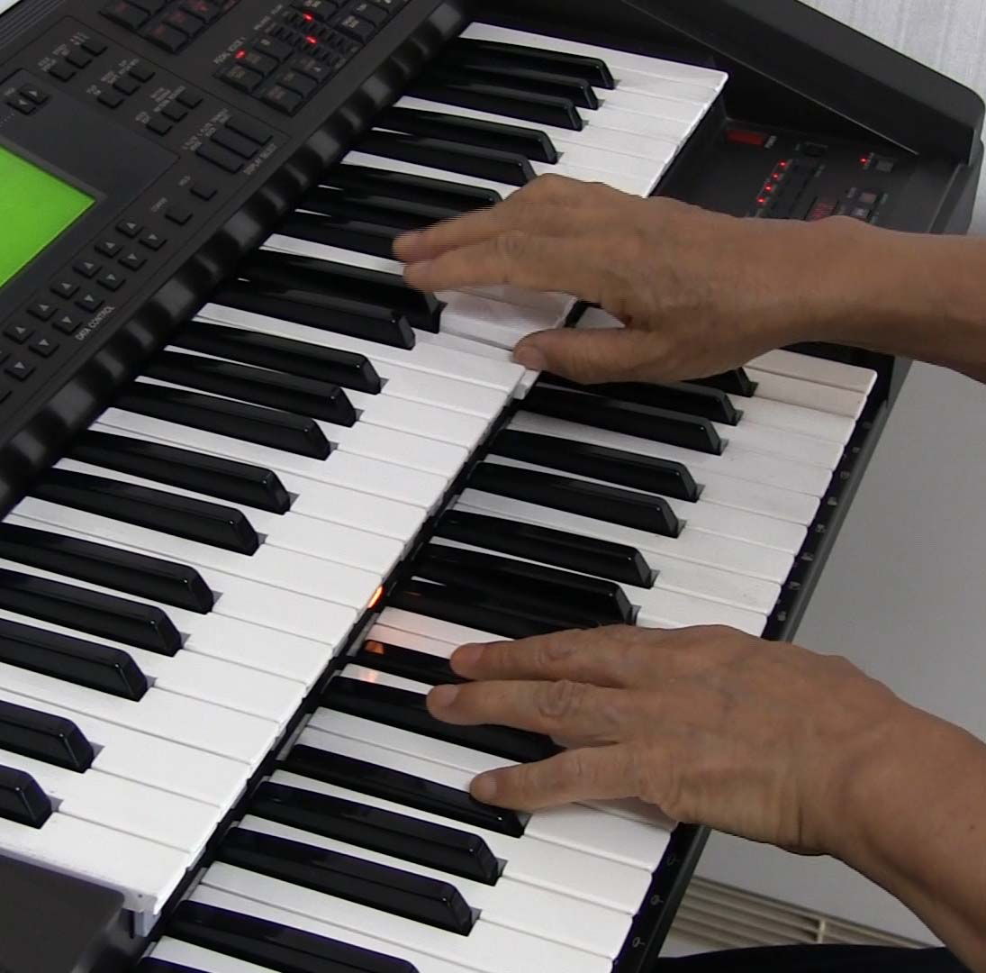 しかし,ビデオ編集の利点をフルに活用し,画像と音声のシーケンスをそれぞれ細切れにし,問題の少ない画面と音声をそれぞれ繋いで編集すれば何とか全体を通した作品が出来上がります。エレクトーンのような電子楽器は,テンポが一定なので切り貼りを容易に行うことができます。このビデオは3脚を使った自撮自演なので,ビデオとして若干難があるのは止むをえません。