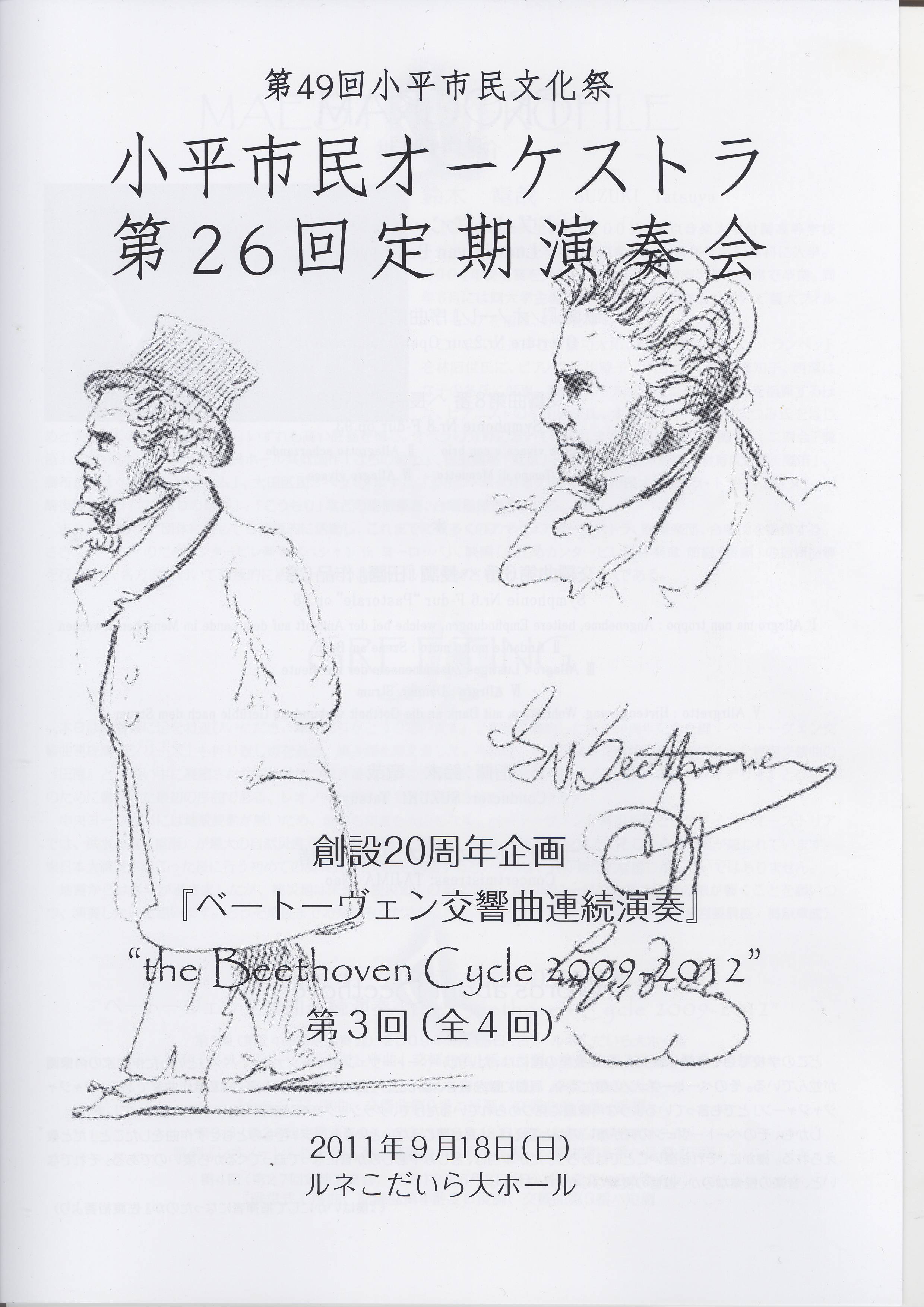 7月21日付けブログでお知らせしましたように、小平市民オーケストラ結成20周年を記念して行っているベートーヴェンの交響曲の連続演奏(いわゆる「ベートーヴェン・チクルス」)の第3回目の演奏会(第26回定期演奏会)が下記プログラムにより9月18日(日)に開催され、多くの方々のご来場をいただきました。(ご参考までに当日のプログラムの表紙を添付しました。)
