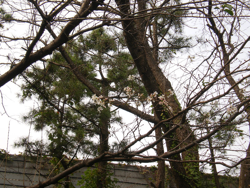 テレビの放送で和歌山県と岩手県で季節外れの染井吉野が咲いたというニュースを聞いてひょっとしたら近所でも咲いているかも…と思いつつ近所の桜の木を眺めていたら、遂に発見した。この写真の他にわが団地の隣の棟の脇の桜も咲いていた。テレビの放送でも説明していたが、和歌山の台風および東日本大地震の強風で桜の葉が総て散り、しかも10月上旬は一旦気温が下がり10月10日頃気温が上昇したため、桜の木は春が来たと勘違いしたのではないかと言っていた。確かに咲いている木は葉がなく咲いていない木には葉が残っていた。