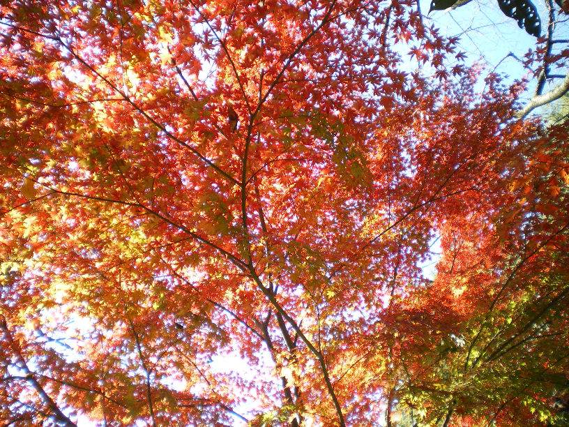 紅葉は花ではありませんが、季節を伝える貴重な材料であり、綺麗なので掲載しました。普段外側から眺めた時の紅葉はそれほど美しいと感じませんが、紅葉の下へ入って太陽光線をバックにして見ると綺麗な色合いを観賞することができます。
