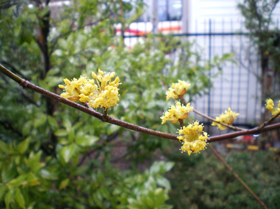 サンシュユ(山茱萸)の他に沈丁花、ヒューガミズキ、トサミズキ等が咲いていましたが、ここにはサンシュユを紹介しました。 |