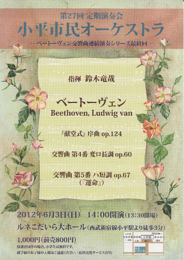 | 私の所属している「小平市民オーケストラ」の第27回定期演奏会が6月3日(日)に開催されます。今回が創設20周年記念事業として行っているベートーヴェン交響曲連続演奏会の第4回目(連続演奏会の最終回)となり「献堂式」序曲、「交響曲第4番」および「交響曲第5番」を演奏いたします。「交響曲第5番」は我が国では「運命」という通称で親しまれている曲です。 | ![]() |