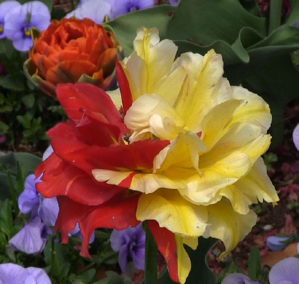 | あけぼの山農業公園では、風車前の1.2heの畑に植えられている15万球の在来種チューリップや5万5千株のビオラを、また公園内の通路に植えられている八重咲きやフリンジ咲きのチューリップなどの珍しい種類を楽しむことができます。 本公園で今年初めて登場した八重咲きチューリップなどは、花だけみているとチューリップには全く見えず、別品種かと思ってしまいます。 |
