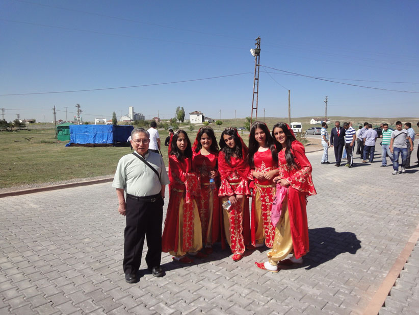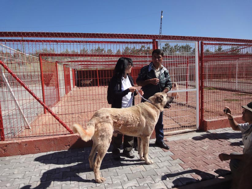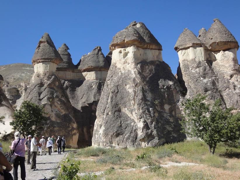 6月17日朝スィバスからバスで約1時間後にカンガルに到着し、トルコ犬を見学した。(写真3)昔、トルコ犬は狼を追い払う為に使われ大きくて強いが、現在は輸出禁止となり、血統を保持するため、自動小銃を持った兵士達が警護していた。写真の女性は、大変お世話になった添乗員の野口さんである。当日はVIPが当地を訪れイベントがあるらしくTVや新聞記者が待ち構えており、ツアー仲間の佐藤さんがTVインタビューを受け、トルコ人のガイド・シナンさんが、通訳した。(写真4)私も当日のイベントに出演する民族衣装の少女達と記念撮影する幸運に恵まれた。(写真5)ここからバスで約1時間、世界遺産ディブリー・モスクを見学した。午後は、バスで約4時間半走り、カッパドキアに到着した。夕方、三姉妹岩を見物した。