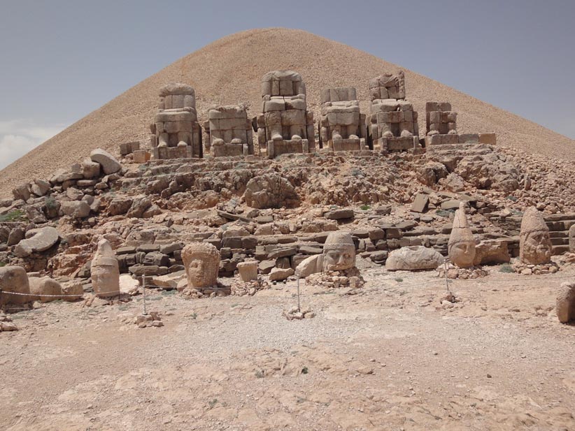 6月16日は、このツアーで最も厳しい日であった。朝7時にバスで出発し、約3時間後にアドゥヤマンに到着。ここで2台のマイクロバスに分乗して約1時間、ネムルート山の中腹まで来た。最後尾の座席にいたので、背中が焼け付くようだった。前方の座席も、窓を開けると熱風が吹き込むので窓は閉じたままだった。山頂は2,150メートルであったが、中腹まで来るとここからは徒歩で登るしかない。瓦礫のような尖った石がごろごろしており、石段らしきものも飛び飛びにあるが、滑りそうで危ない。40分でやっと世界遺産の石像群に到着した。(写真2)