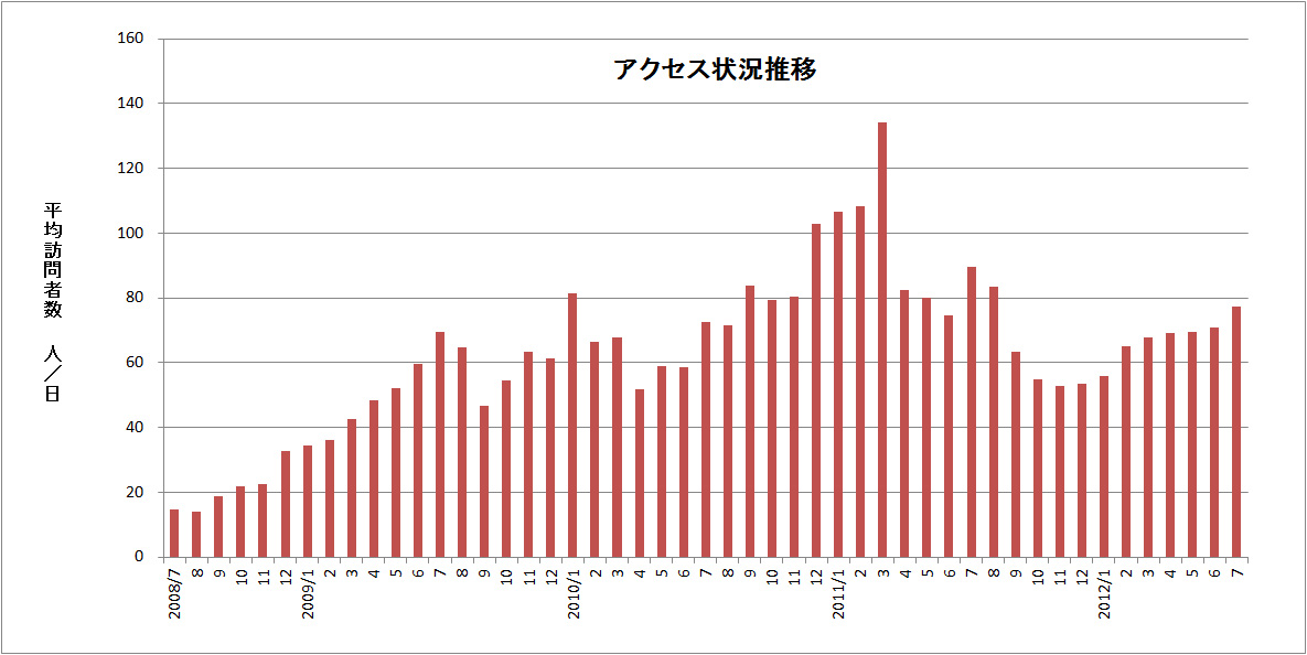 スタート以来のアクセス状況推移は下のグラフに示すようになっています。(2008年7月は28~31日の4日間、2012年7月は26日までの集計)