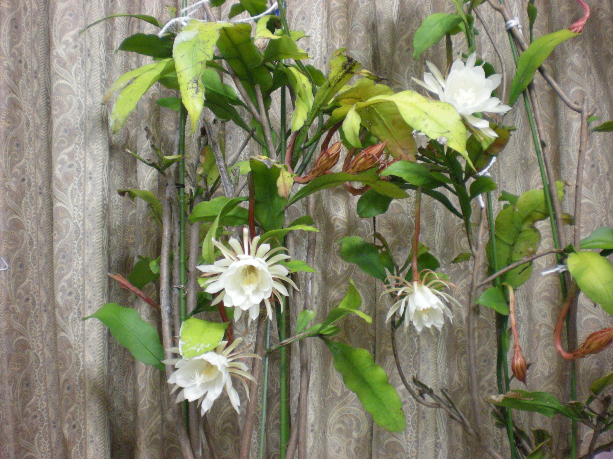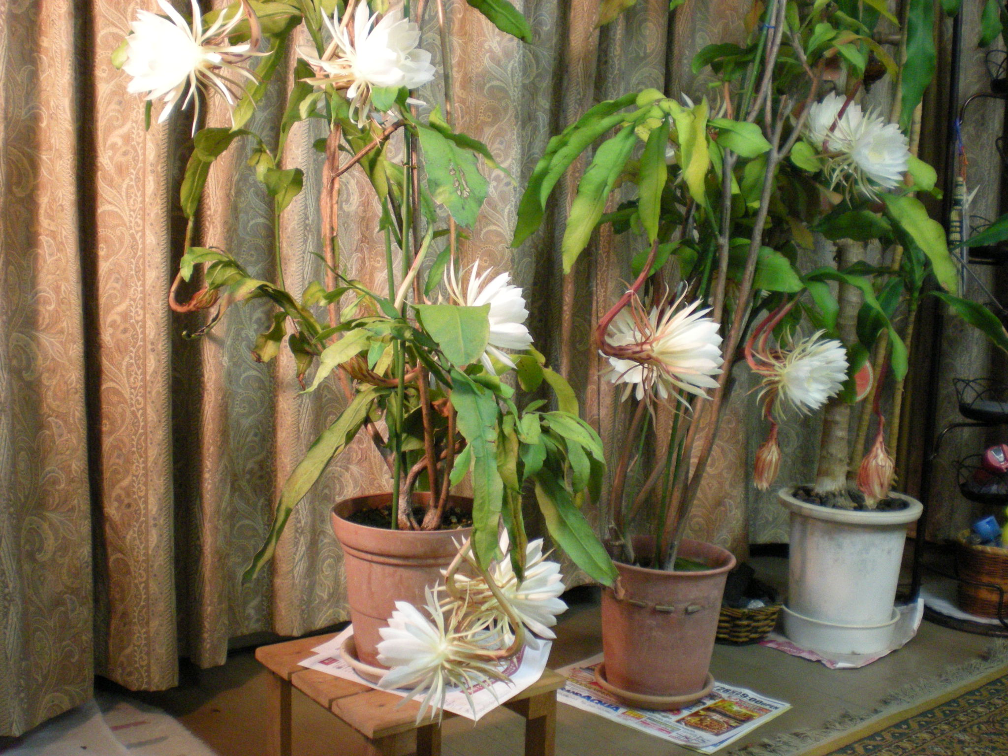 この越冬スペースと開花日の室内持ち込みの為、鉢植えで高さ1.5m位、スペースも余り取らぬ様に剪定と新芽の誘引をしてこの様な樹形に仕立てています。もっと枝を広げると花付も良いかと思うが、これでも沢山開花した時は可なり見事です。写真は2009年9月、この年二度目の開花ですが、この晩は左が5個、右が7個の開花でした。この時は花が大きく重みで枝葉が垂れて急ぎ置台を作りました。こんな雑然とした有様ですが、部屋は花と香りが一杯でちょっとリッチな気分でした。(Foto4)