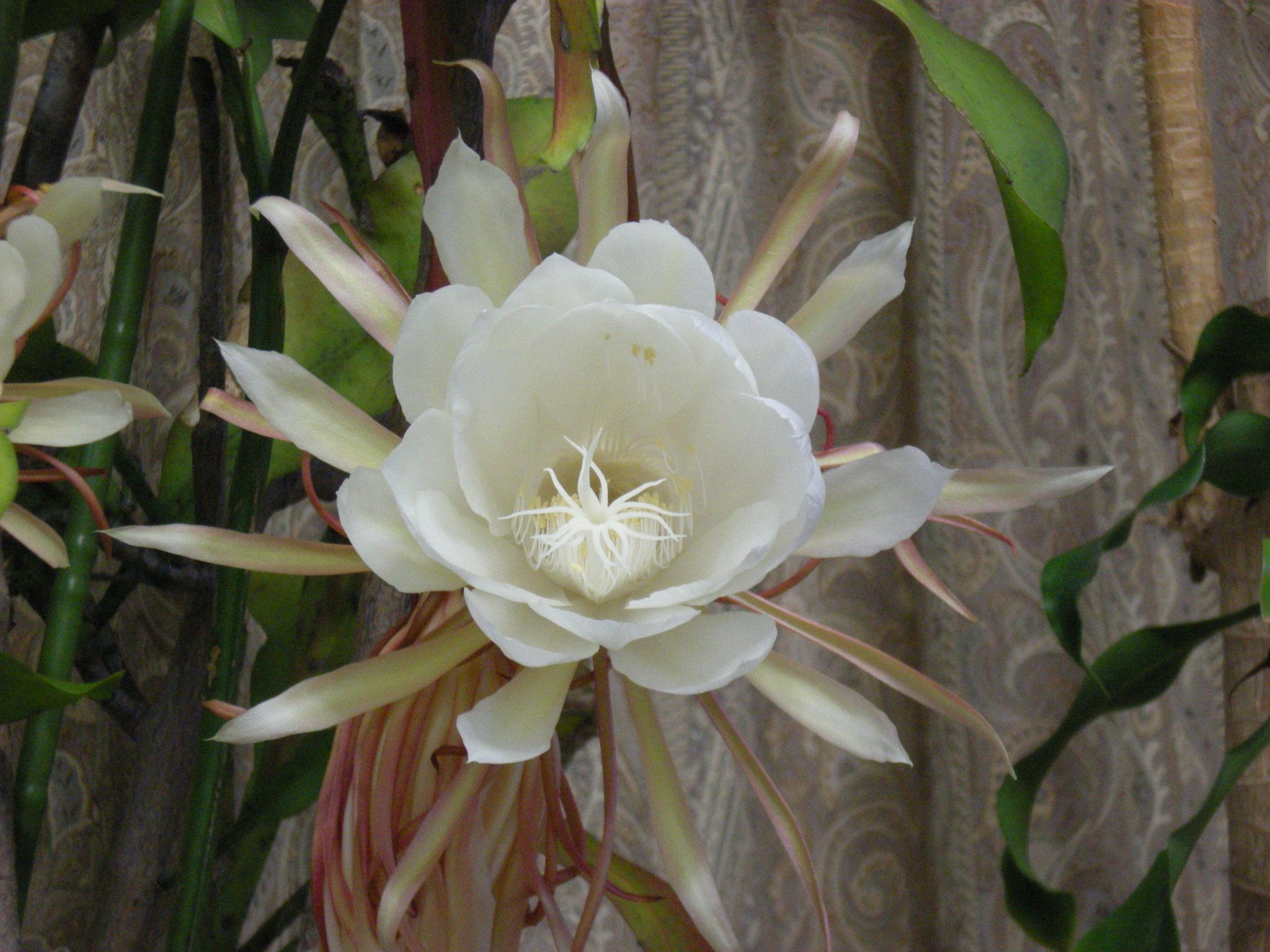大船植物園の月下美人は昼夜逆の栽培をした様ですが、私の所の自然の栽培では大体夜8時ころから開花し始め、9時過ぎに満開となります。かなり夜更かしの花ですが翌朝にはもう萎んで情けない様相となります。