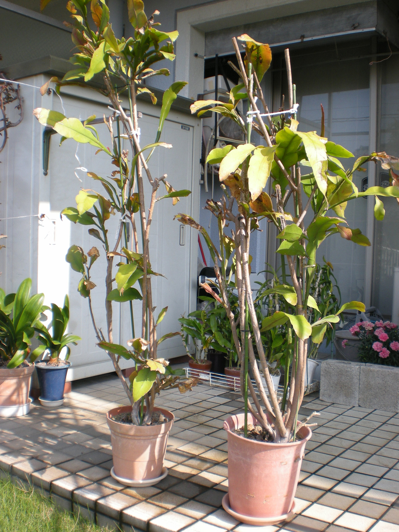 ただ当地の冬は何かしてやる必要があり、株を頂いた時もこれが課題でした。初めの数年は室内で越冬しましたが、大きくなるとそうも行かずマンションの1Fで庭とテラスがあるので、冬季だけ一隅に小さな仮設温室を作っています。これは2Fのテラスが庇の様に出て居るのを利用して、その下面にビニールシートのカーテンを吊り下げる形で0.8x2m位の囲い空間を作りました。暖房無しですが冬季日中は日光が差し込むので外気より数度高くなり、夜も余熱と片面が家に接していて冷え込みが少なく十分越冬してくれます。春になるとカーテンは仕舞って株は陽の当たる所に出して育てます。 (Foto3)