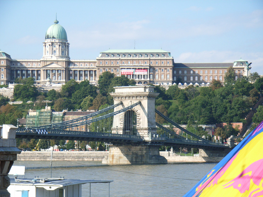 その内に、前日訓練していた航空ショーの本番が始まった。圧巻は、急降下して鎖橋の下を潜り急上昇するアクロバット飛行である。急降下する時は、鎖橋とアルギット橋の間隔は1.5km位、急上昇する時は、鎖橋とエルジェーベト橋の間隔は0.8km位である。鎖橋と川面の間隔はどれ位か判らないが、NEC OBパレット会で真偽の程が論争になっていた。
