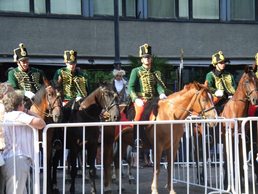 写真7は出発前の騎兵隊である。中央奥に白い毛の縁がある帽子をかぶっているのは女性の騎兵で、東洋系との混血で素晴らしい美人であった。更に騎兵隊のパレードを近くで撮影したが、護衛官の大きな頭が入り残念だ。当日は大統領も参列されたので、護衛官が多数いて、厳戒態勢であった。写真8 のように、民族衣装のパレードが地方各地から参加して旗を先頭に延々と続いた。写真9 は大僧正と思われるが、宗教関係者の行列、写真10 のようなVIPや軍人の行列など多彩であった。先頭は大統領かも知れないが、よく判からない。