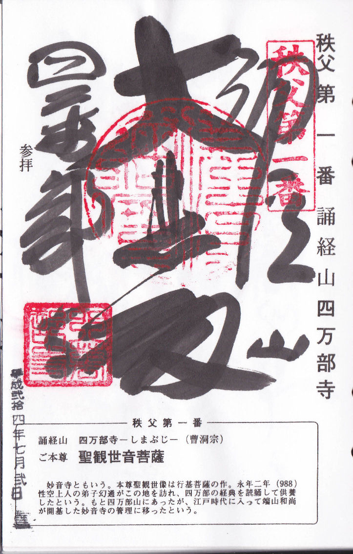 26番から10分ほどのところにある28番橋立堂は件の武甲山のすぐ麓。背後にはきりたった崖がお堂を守るように迫っています。石灰岩の塊であるこの山のことを考えると鍾乳洞があって当然。寺の脇に洞への入口があり、200円の入場料を払ってなかに入ってみるとそこには鍾乳石は全くなくて、富士山ろくの風穴を思わせるただの岩穴。なあんだとがっかりして入口で尋ねますと鍾乳石はすべて盗掘されてしまったのだそうです。本尊が如意輪観音の30番法雲寺にお参り。そのあと三峰山にあがって神社にお参りし、秩父湖のあたりを散歩と思っていたのですが、おそい昼食をした寺のそばのそばやで尋ねましたら「頂上まで車でもまだここから40分はかかりますネエ」との返事。帰りが暗くなるのを嫌ってこの日はここで帰途につきました。