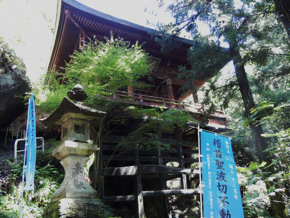 聖観音をまつる26番円融寺は国道沿いの比較的平坦なところにありますが、ここから昭和電工の工場敷地を抜けて山道、そして200段余りの石段を上がったところに岩井堂と呼ばれる奥の院があります。この奥の院の舞台から眺める緑に囲まれた秩父盆地は平和で静かな佇まいでした。