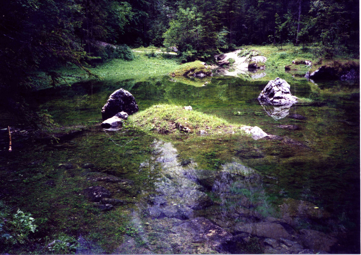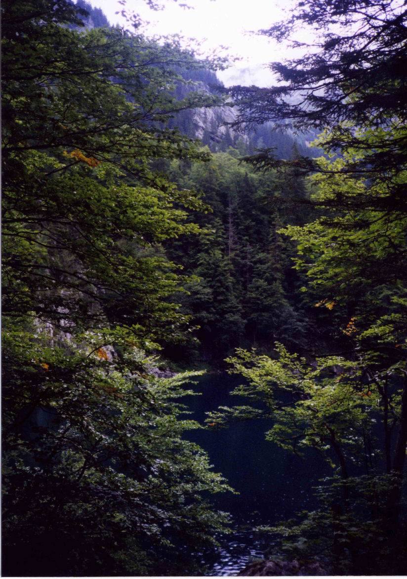 前ゴーザウ湖の周囲の道はかなり良い。比較的早く半周したので、欲が出て、後(ヒンデラー)ゴーザウ湖まで行くことにした。途中は小道であったが、素晴らしい水溜り(写真6)などがあり、元気が出てようやく後ゴーザウ湖の入口に辿り着いた。(写真7)その時小粒の雨が降り始めた。湖の反対側には山小屋がある。そこまで行きたかったが、親切な日本人一家の忠告を思い出した。急遽引き返すことにしたが、その直後、忽ち天候は一変し、強烈な雨で、登って来た小道は泥水の急流となり、大音響の雷が山中の谷間に響き渡った。