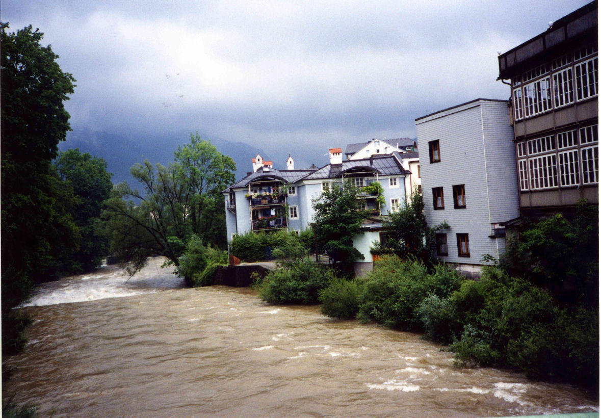 傘は持参していたが、雷が怖くてさすことが出来ない。レインウエアーだけで、家内と二人で転げるように谷間を降りた。(写真8)かなり麓近くまで来ると、大きな木の下で子供連れの外国人家族が数組雨宿りをしていた。しかし私達はバス停まで行き早々と宿に帰った。翌朝、バスでバート・イシュルに行ったが、川は氾濫寸前であった。(写真9) 大急ぎでフランク・ヨーゼフ皇帝お気に入りのカイザーヴィラを見物して、再びバスでザンクト・ヴォルフガンクに向った。