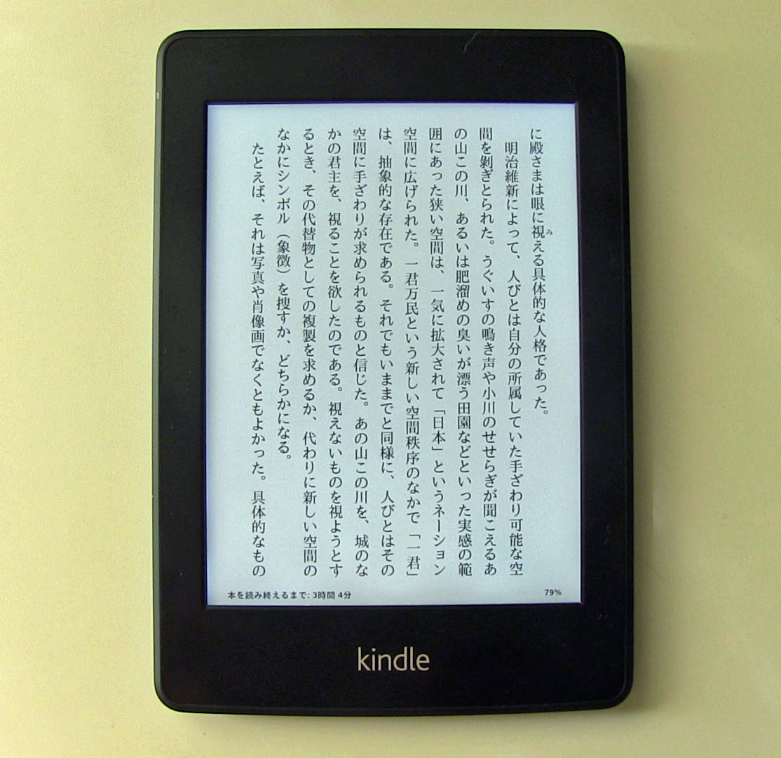 今回入手したKindle Paperwhite 3Gの画面は,内臓のナノインプリント・ライトガイドにより紙面を読むのに近く,長時間読んでも疲れないe-inkディスプレイで,文字の大きさも8段階で選ぶことができます。文庫本など字が小さいことが多いので,電子書籍リーダーは後期高齢者には有難いデバイスだと思います。また,サンプルダウンロードという立ち読み相当の機能もあります。難を上げれば,書店で選ぶのと比べて欲しい本に到達するのに時間がかかることでしょうか。 電子書籍リーダーの場合,書籍の購入は携帯電話と同じ3G接続経由です。通常この契約や設定が必要になりますが,Kindle Paperwhite 3Gの場合,すでにこの契約が含まれており,3Gの使用料も必要ありません。到着したリーダーには「森山寛美さんのKindle」と表示されており即時使用が可能です。また,Amazonにはアカウントが登録されているので,発注・ダウンロード・決済が1クリックで済みます。これまで紙の本で狭い部屋の小さな本棚が満杯になり,何度もBOOK OFFのお世話になったものですが,これからはできるだけ電子書籍を利用し「地球を愛する」エコな読書に移行しようと思うこの頃です。