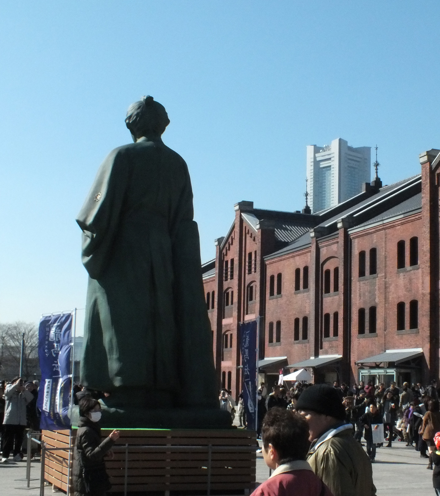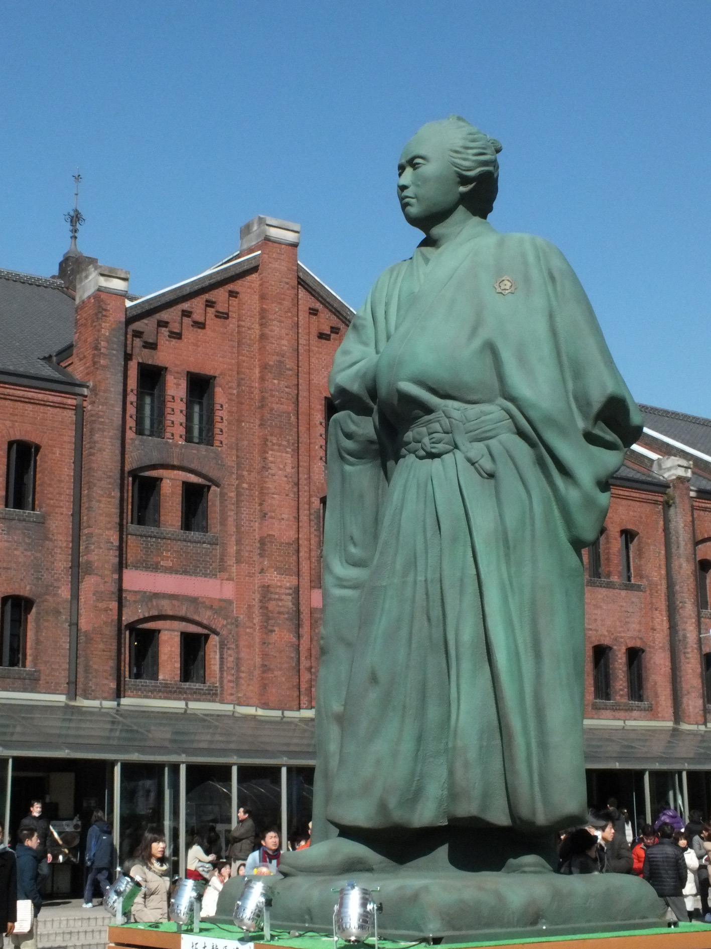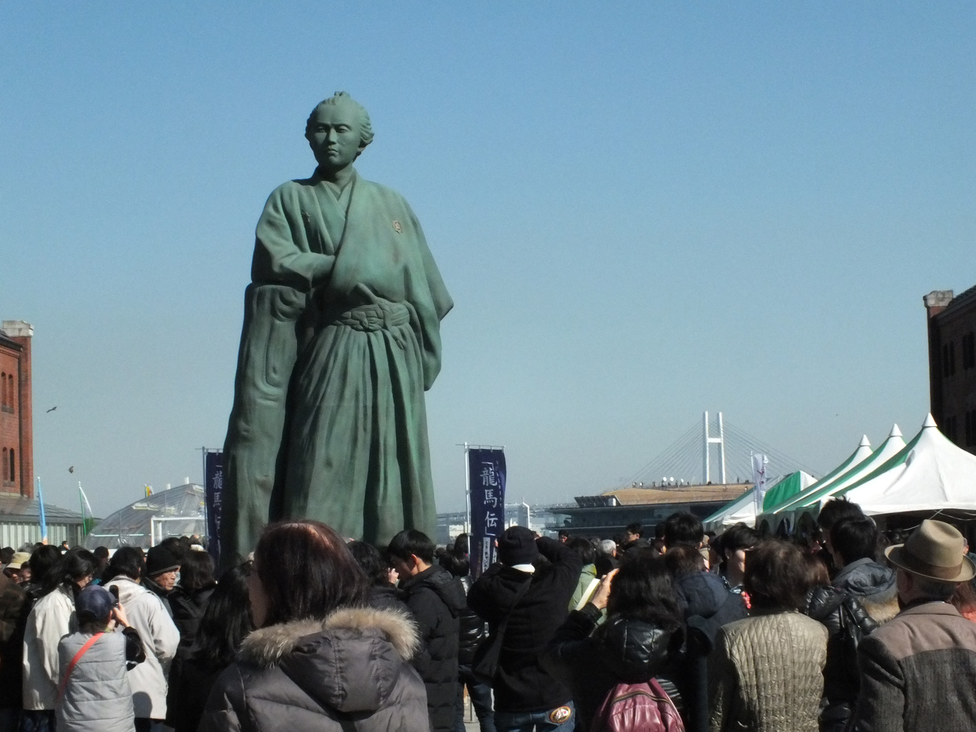 2月10日は好天にも恵まれ、3連休の中日ともあって赤レンガ倉庫周辺はすごい人出。龍馬の像の近くは写真を撮りたい人で大混雑、像に近づくのにかなりの忍耐力を要したが頑張っていろいろな角度から写真を撮ってきた。 近くで見るとなかなかの迫力で、幕末の闘士にふさわしい気迫に満ちた風貌であった。