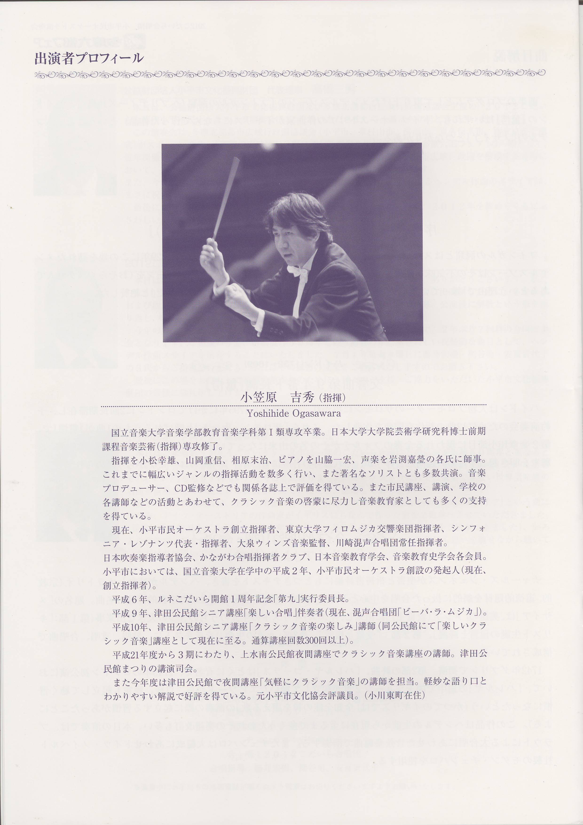 昨年9月のブログでご紹介しましたように、12月16日(日)にルネこだいら 大ホールで「2012こだいら合唱団・小平市民オーケストラ 合同演奏会」が行われ、多数のお客様のご来場をいただき、無事終了いたしました。指揮者の小笠原吉秀氏(添付の出演者プロフィール参照)は、9月のブログでもご紹介しましたように、「小平市民オーケストラ」の創設指揮者で、また現在は「東京大学フィロムジカ交響楽団」の指揮者も勤められている方です。当日のプログラムは、
