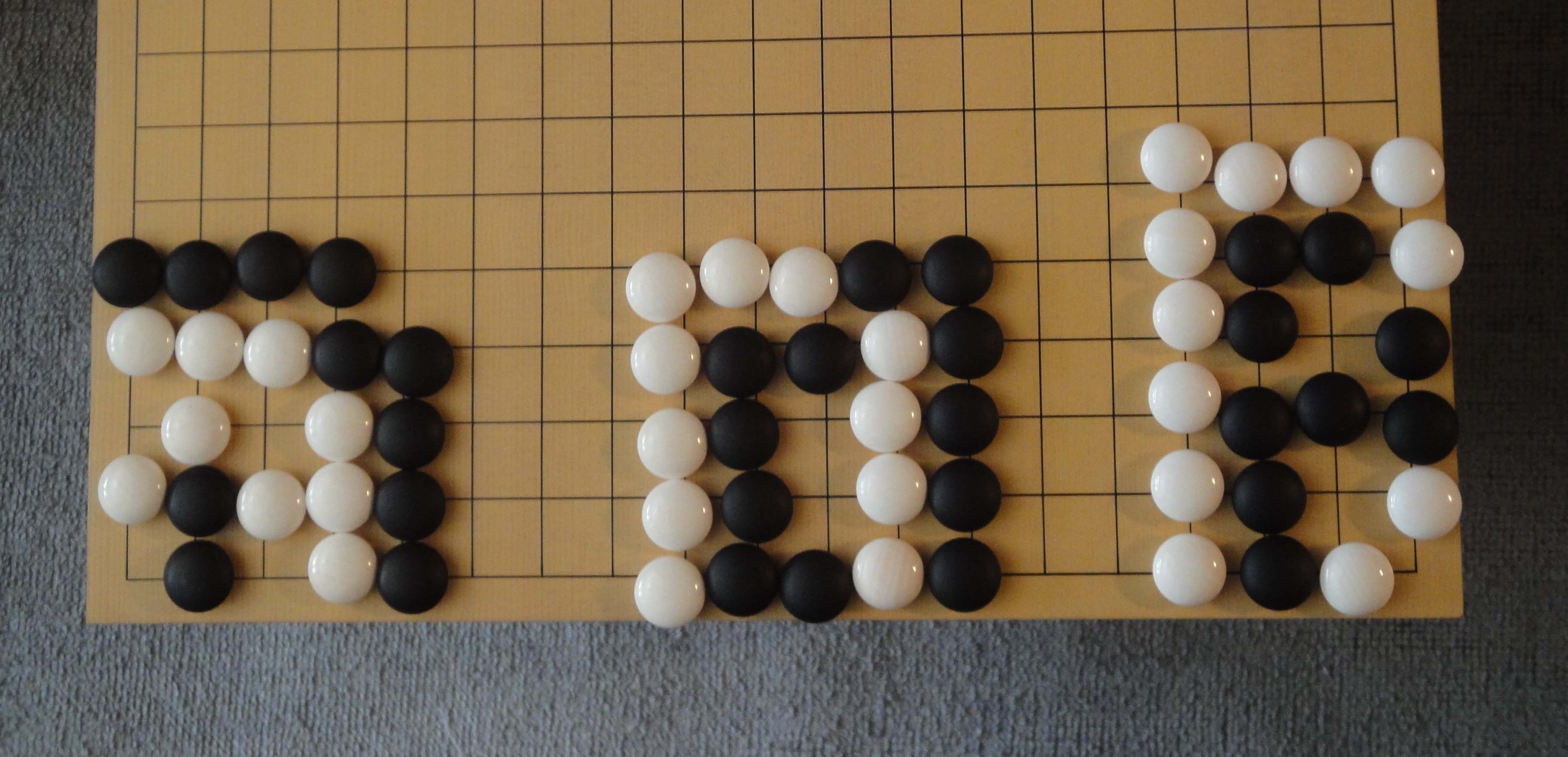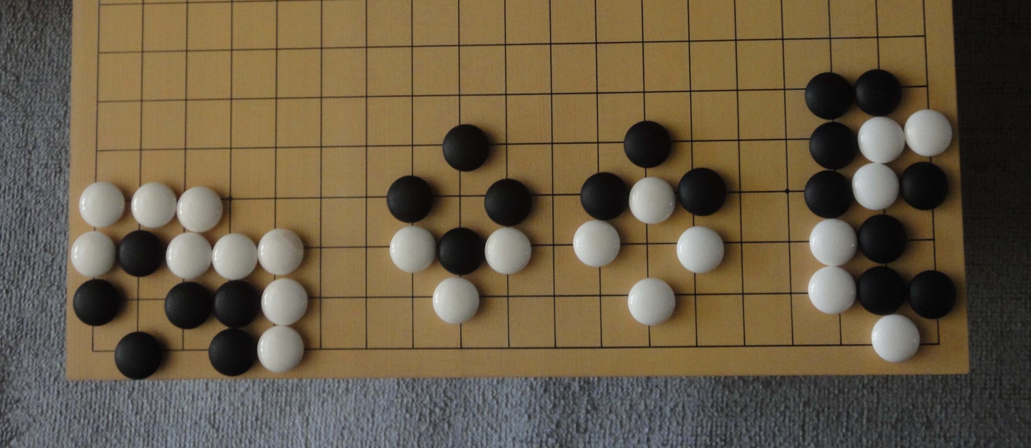 注1:交互に相手の石 1個を取り返し得る形を「劫」という。このままでは永久に続くので、劫を取られた方は、次の着手で別の所に劫材を探し、劫立てをしてから相手が受けてから劫を取り返すルールが設定されている。(写真1「 劫」の例) 注2:「セキ」とは、どちらが打っても、打った方が取られる形で、双方ともその場所は打たないので、陣地は0と計算する。(写真2「セキ」の例)