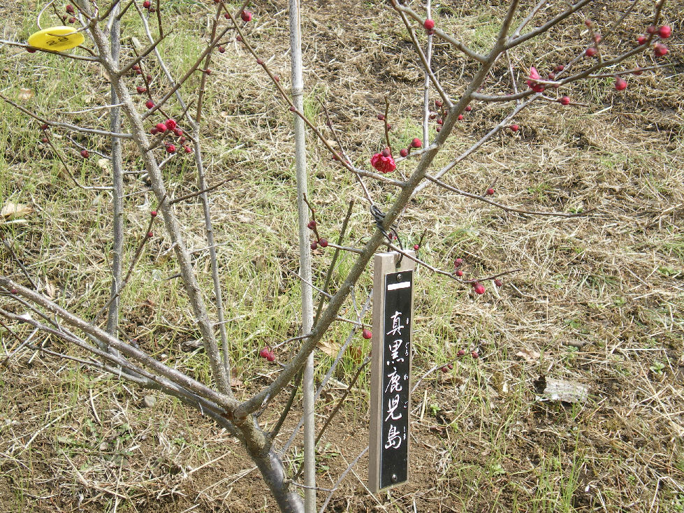 最も紅の濃い梅だそうです。寒さのために一輪だけしか咲いていなかったのが残念です。木はまだ小さく樹高1メートル位でした。 |