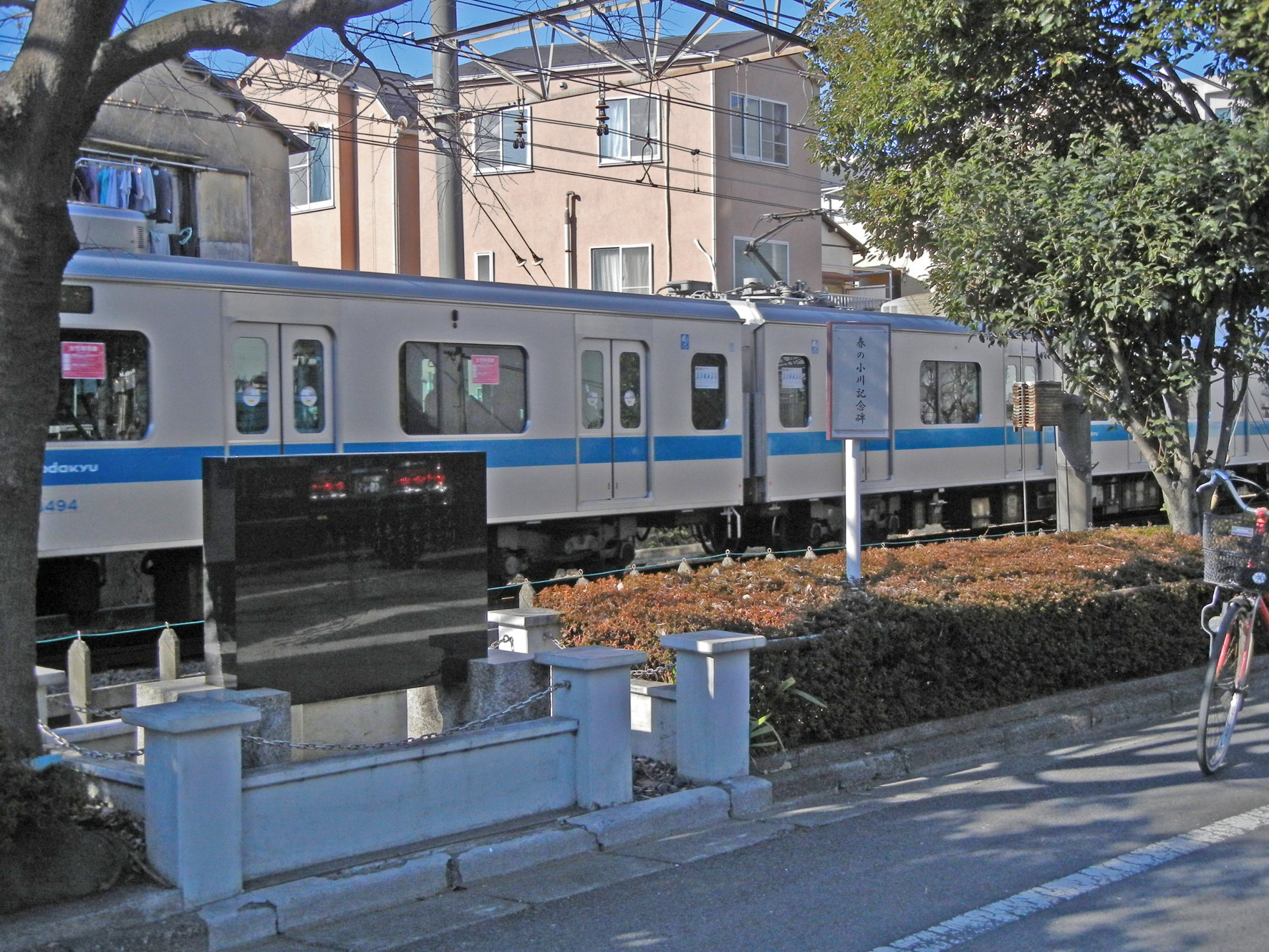 渋谷区のスポーツセンターになっている隣地に明治牛乳の看板を掲げた一軒の古い家がその名残をとどめています。ここから東に坂をおりたところに小さな川が流れていました。黄色のかわいらしい花をつけるちょっとハスに似た「こうほね」が咲いていたので河骨川とよばれていました。春になるとあたりには蓮華やすみれが咲くやわらかい起伏のあるのどかなところだったようです。その風景に魅せられた文学者の高野辰之氏が作詞したのがいまでも歌われている春の小川。1912年のことでした。時は100年を経てこのあたり住宅が建ち、川は暗渠になってもはや当時の面影はまったくありません。その一角、小田急の線路沿いの小さな公園に昔の由緒を記す黒曜石の碑が建っていて、そこに小川の流れる野原の風景が刻んであります。今の街なかの子供たちにはこんな自然はないな、世の中悪くなったものとしみじみと感じさせる絵です。