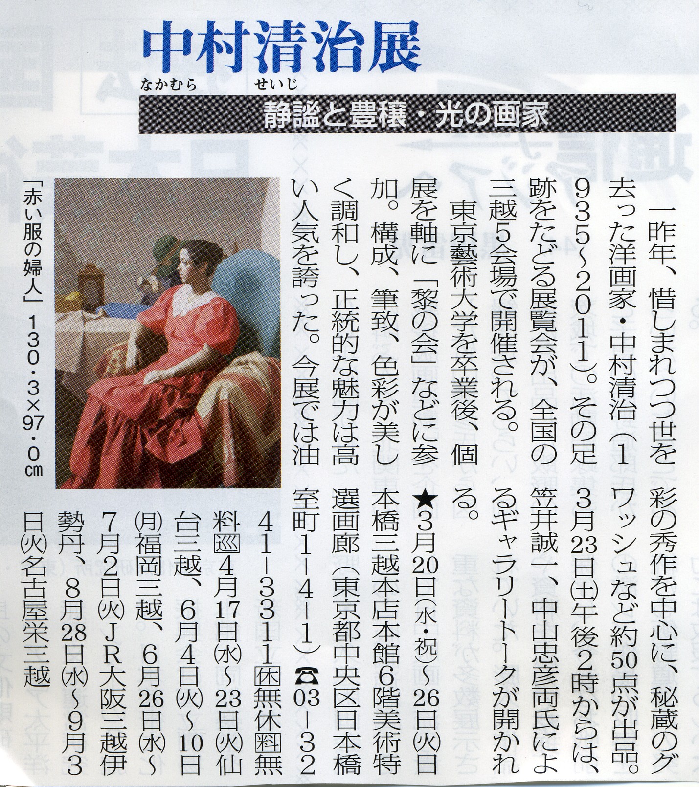 印象に残る個展も数々あるが、2004年4月に偶然、銀座の泰明画廊で中村清治展に立ち寄った時は、強烈なインパクトを受けた。私の目指す写実的な画風で、「モレー風景」「フィレンチェ風景」などの他、静物、人物画すべてに感銘を受けた。更に画集を見て、1995年に右手が不自由となられたが、1997年には左手で描いて個展を開催され、絶賛を博されたことを知り、驚いた。残念なことに、中村画伯は、一昨年に逝去され、今年3月には日本橋三越本店で展示会が開催され、順次、仙台、福岡、大阪、名古屋で開催予定である。(写真、中村清治展:新美術新聞掲載)