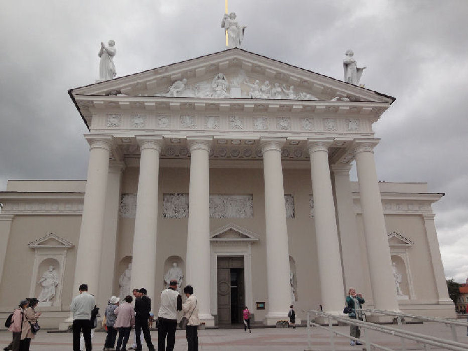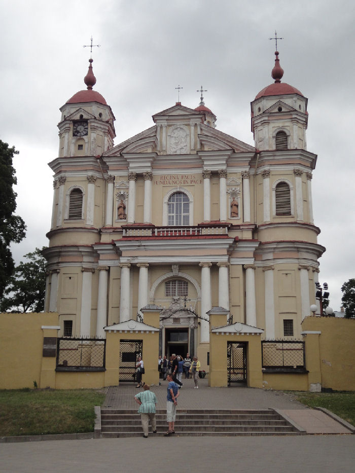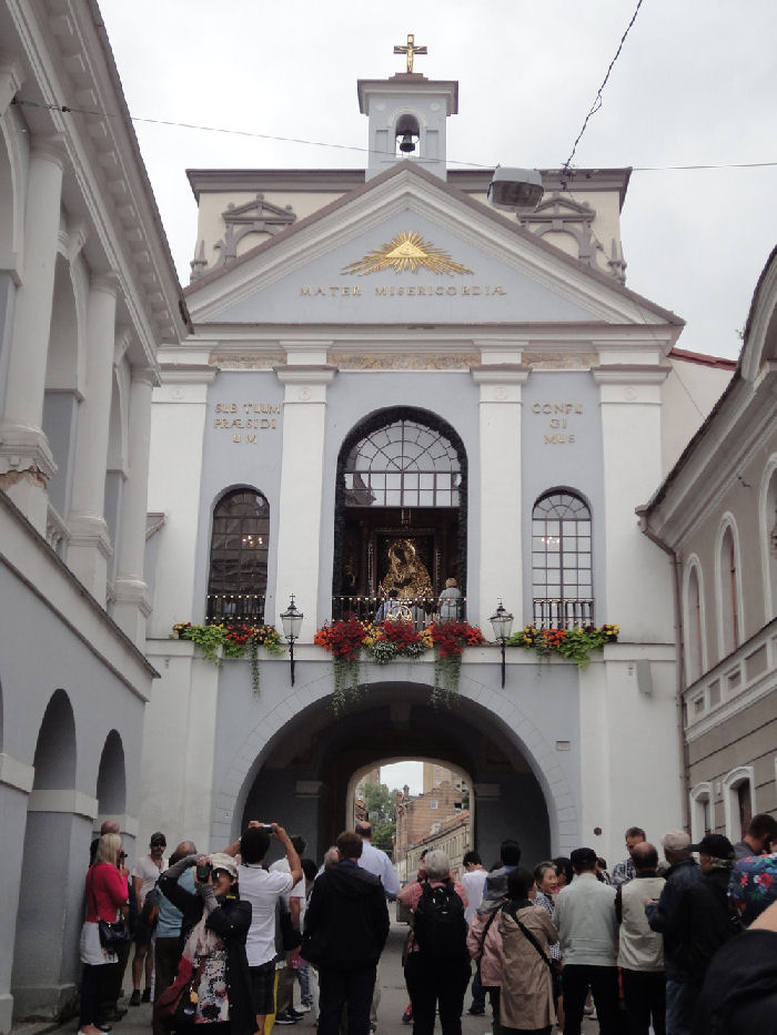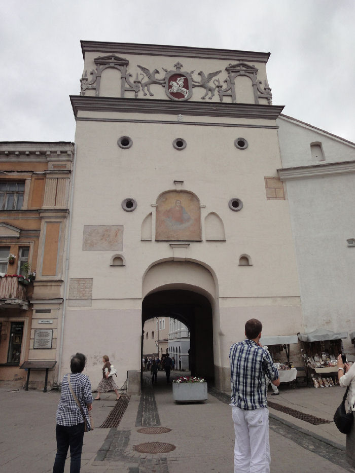 6月27日午前は、「世界遺産」ヴィリニュスの市内観光であった。先ず聖ペテロ&パウロ教会(写真1)を見学。バロックの「凍れる音楽」と呼ばれる教会に入ると、2,000を越す漆喰彫刻群に時の経つのを忘れてしまう。それぞれの彫刻には製作者の技が結集され、とりわけ聖女の彫刻は素晴らしい。続いて「夜明けの門」を訪れた。9つあった城門のうち唯一残存している。場外から見た「夜明けの門」は(写真2)であり、上部にリトアニアの紋章(Vytis)があり、その下部に5つの銃眼がある。内側から見た「夜明けの門」は(写真3)であり、昔は城壁の一部であった。