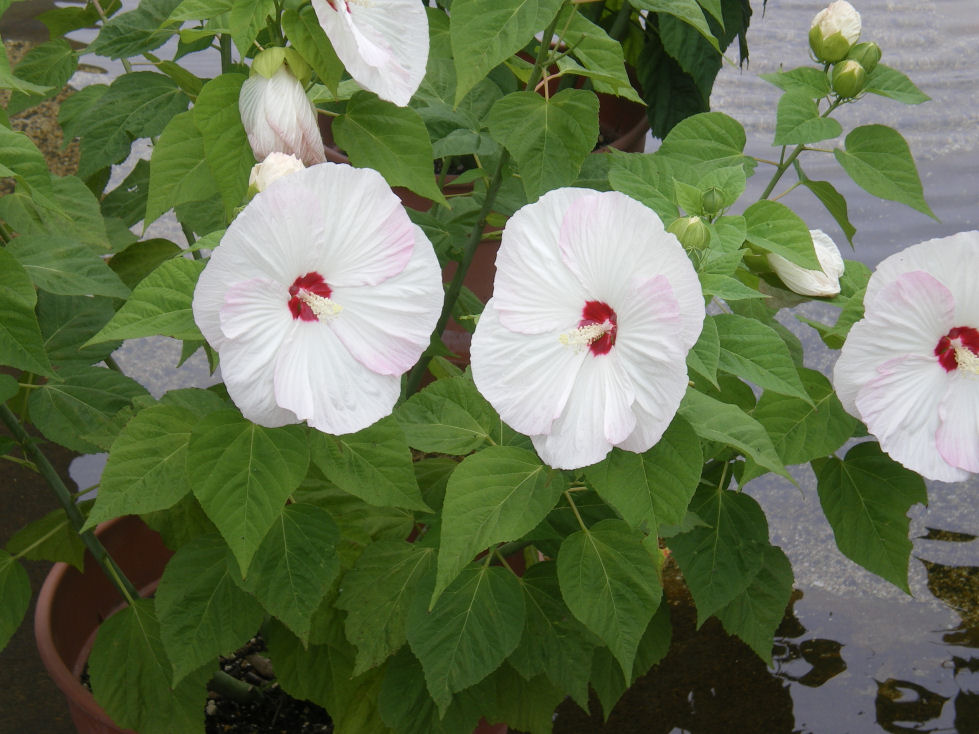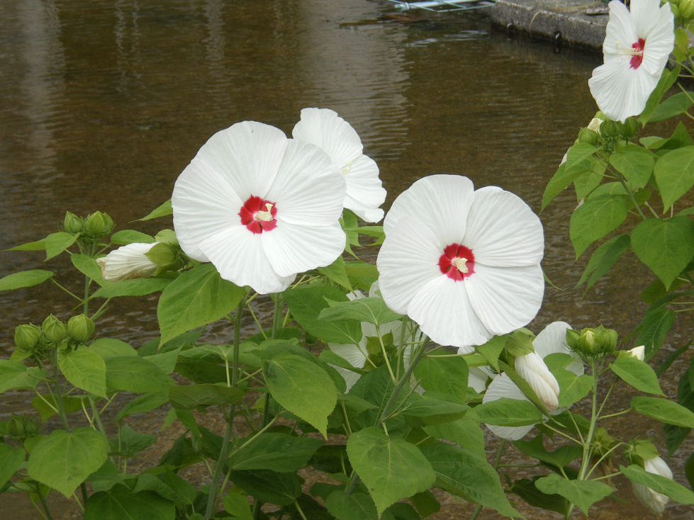 ●ヒビスカス・ディスコベル(白・赤・薄ピンク):この3点はすべて7月16日に撮影しました。場所は相模原公園です。公園内にグリーンハウスがありますが、この建物の周囲に人工池があり、その中に大きな鉢が置かれておりその鉢に植えられていました。遠くから見たとき、大きな花が見え、近くに行き驚きました。直径20cmほどの花です。
