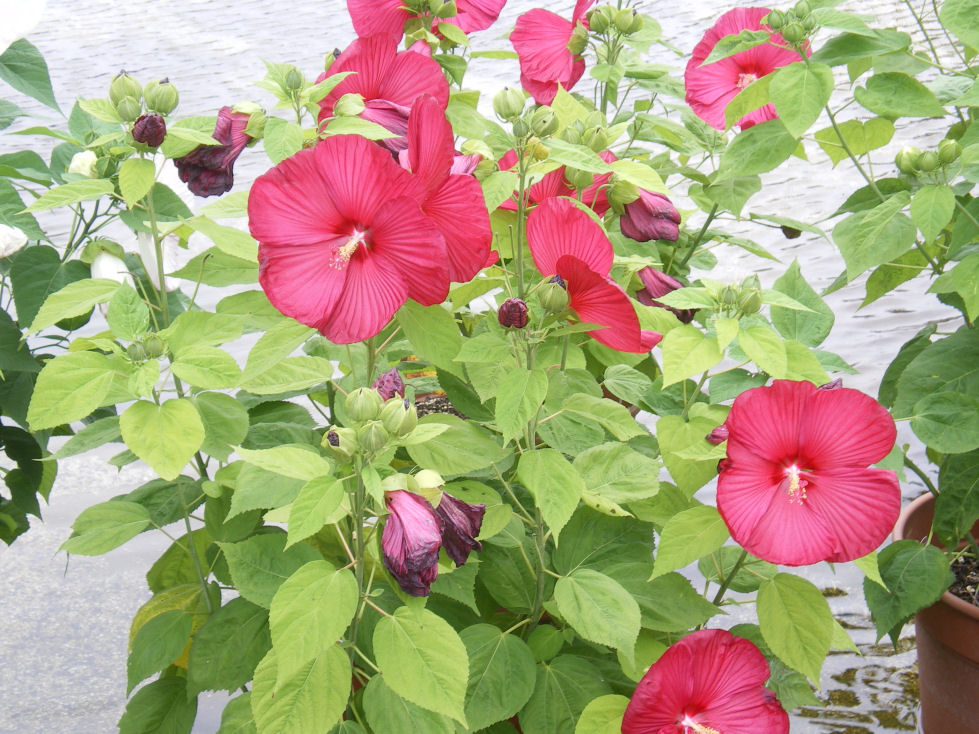 別名:「アメリカフヨウ」と言います。寸法を小さくすれば「芙蓉」や「むくげ」や「ハイビスカス」などに似ています。 |