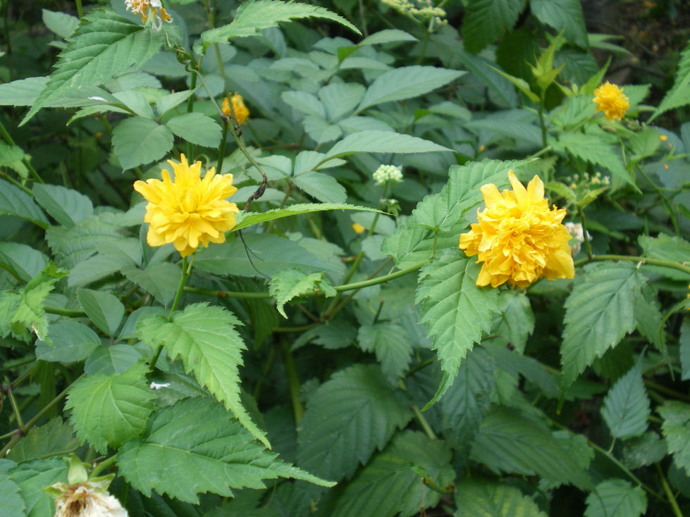 ●ヤエヤマブキ(八重山吹):この花についても、既に2010年5月、2013年5月にこのブログに掲載済みで、それぞれ4/16、4/15に撮影した写真を載せています。また、Webで八重山吹を検索してみると、八重山吹の開花時期は山吹よりも少し遅い(4/15~5/5頃)と出ています。東大の小石川植物園で8/13日に咲いていましたので、不思議に思い、植物園の入り口の受付の職員に何故今頃八重山吹が咲くのですか?と聞きましたが、わからないと言っていました。 |