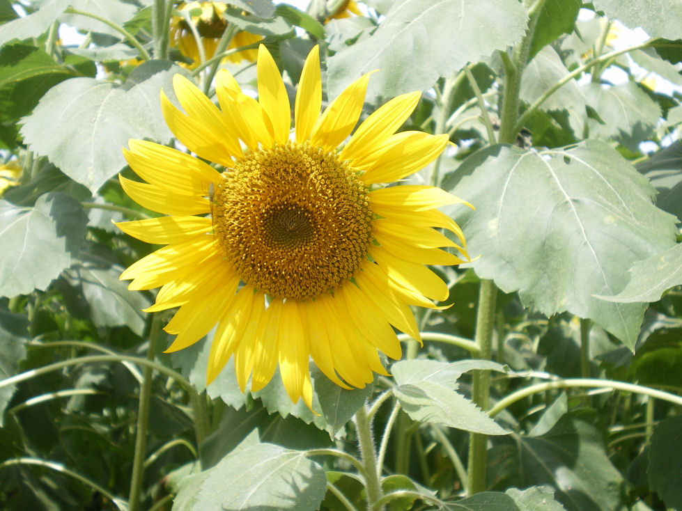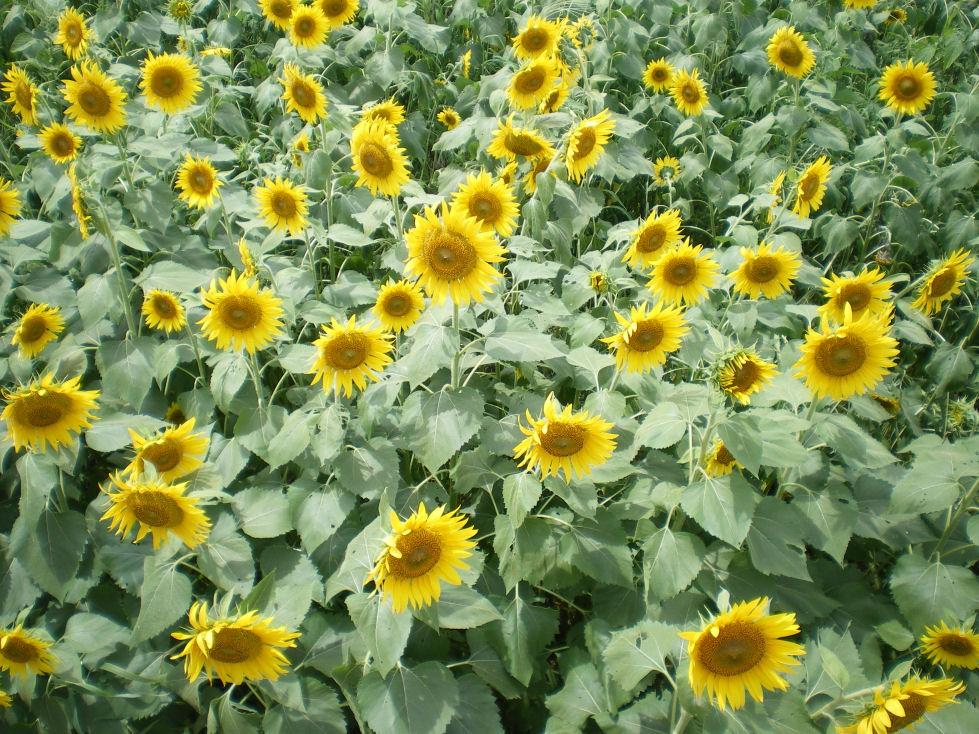 暑い夏にぴったりの花と云えば、ひまわりでしょうか。座間市でひまわり祭りが開かれるとの情報を見て行ってきました。会場の中に展望台が出来ていてそこからの写真が最後の写真です。この2枚の写真をよく見るとわかりますが、なぜか花は太陽を背にしています。向日葵(ひまわり)というから太陽を追いかけて向きを変えると思っていましたが、実は蕾の頃はそのようですが、それ以降はそうではないようです。 |