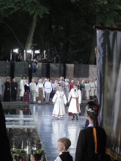 本日は5年に一度しかない「ラトヴィアの歌と踊りの祭典の開会式」が公園で、21時~24時まで開催される。このツアーのハイライトなので、早目にホテルに帰り休養をとった。 17時半にホテルを出発したが、公園に到着すると参加者は未だまばらであった。予定では早目に見物の場所を確保して、日本から持参したビニールシートや携帯チェアで待機するはずであった。ところが、現地ガイドが愛国心を発揮して、通常は見られない所を案内すると言いだして、川の対岸のスターリン時代の港の建物や像が見える場所に連れ出し、2時間近く時間を浪費した。メンバーは良い座席が無くなるのではと言いだしたが、添乗員は現地ガイドに従った。昼間の掏摸事件の弱みで強く言えなかったらしい。公園の式典がある池に戻った時は、既に薄暗くなり大勢の人達で埋め尽くされ、池を取り巻く小道のベンチに座らせられた。現地ガイドは「小道の前をパレードが通り、背後の樹間でダンスがある。列席のVIPや、パフォーマンスの映像は池の入口のスクリーンで見えます。」と出まかせを言った。しかし、暗い小道の前にパレードが来ることはなく、背後の樹間ではダンスもなかった。スクリーンの映像は大半がコマーシャルであった。止むなく人垣に潜り込んでパフォーマンスの一部を撮影したのが(写真9)である。年配のご婦人は大きなビデオカメラを持って来たが、真っ暗な闇ばかりで、日本で編集を楽しみに待っているご主人に説明のしようがないと怒っていた。ホテルに帰るバスに乗ったら、現地ガイドが「5年後にまた来てください。」と挨拶したので一層怒りが増幅した。5年後には生きていないかもしれないし、生きていてもこんなツアーには参加できないであろう。英語は話せるが、自分の役目は何であるか、お客は何を望んでいるか、を理解していない現地ガイドのために、千載一遇の機会を逃してしまった。その後、別のツアーに参加した人達から「良好な場所を早くから確保して、満足なビデオや写真を撮影できた。」と自慢話を聞かされた。