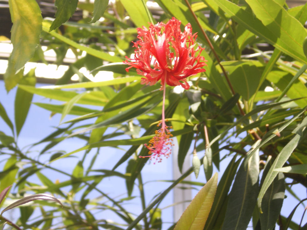 ユニークな花姿を見せる、ハイビスカスの一種。花弁は細かくちぎれるように裂けて、しかも上向きに反転している。長い花柄が垂れて開花する。
