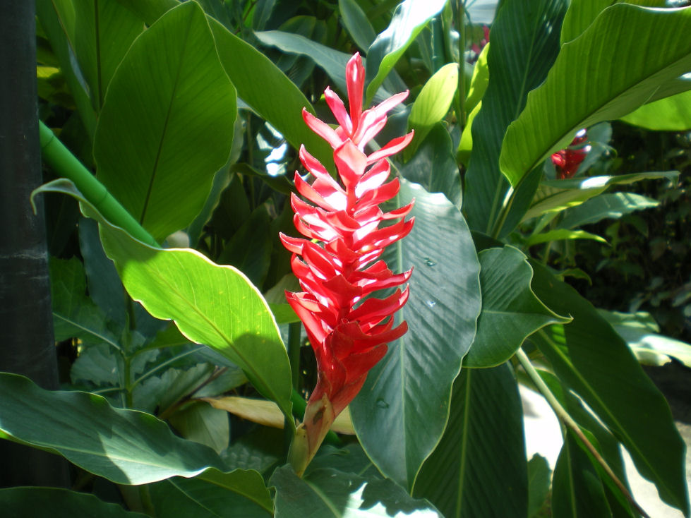 マレーシアなどの太平洋諸島が原産のショウガ科の多年草。赤い花のように見えるのは、長い松笠状の苞で、その間から出る小さいものが花です。この写真からは花は確認できません。観賞用に温室で育てられるようです。ジンジャーの仲間で、苞が赤いので、レッドジンジャーとも呼ばれる。