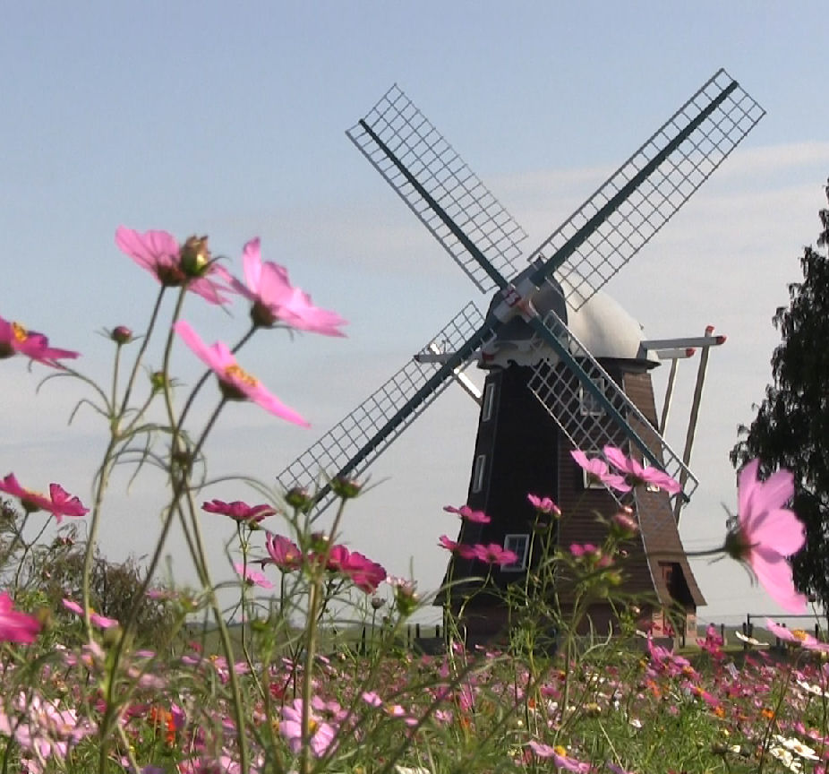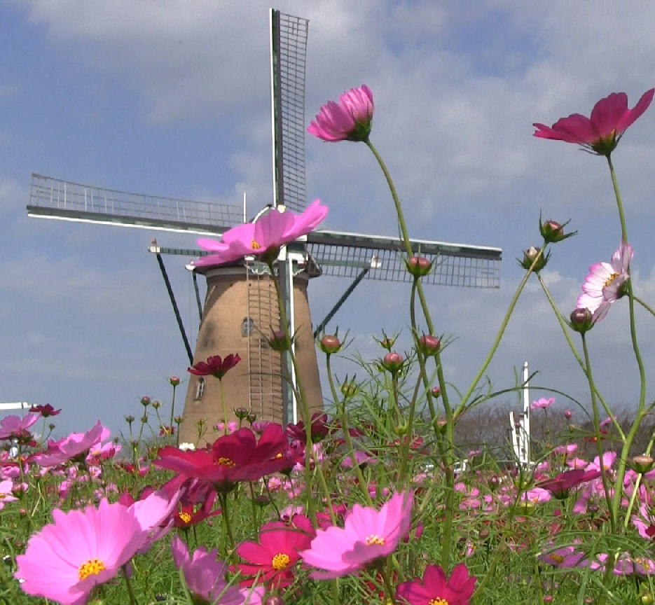 オランダ風車には春のチューリップがよく似合いますが,風車バックのコスモスも悪くありません。