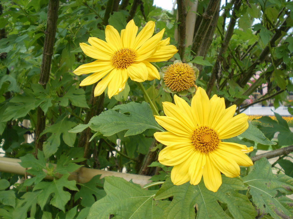 正式名称は「チトニア・ディバーシフォリア」、流通名が(ガリバー)(宿根性ヒマワリ)(テイオウヒマワリ)だそうです。メキシコ南部~中央アメリカ原産のキク科の植物。花は向日葵に似ているが、植物の背丈は4~5mもあります。右側の写真参照。