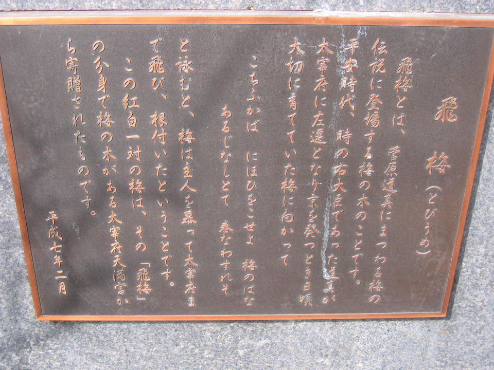 ここに書かれているのは、飛梅伝説と言われるものですが、庭木の内(桜と松)にも伝説があるようなので、少し触れてみます。まず、桜は主人(道真)が遠くに行ってしまうことを聞いて悲しみ枯れてしまったとのこと。松は梅と一緒に空を飛んだが、途中で力尽きて現在の神戸市須磨区板宿町付近の丘に降り立ったとか…。この丘を今では「飛松岡」と言うそうです。後者を飛松伝説と言うそうな。