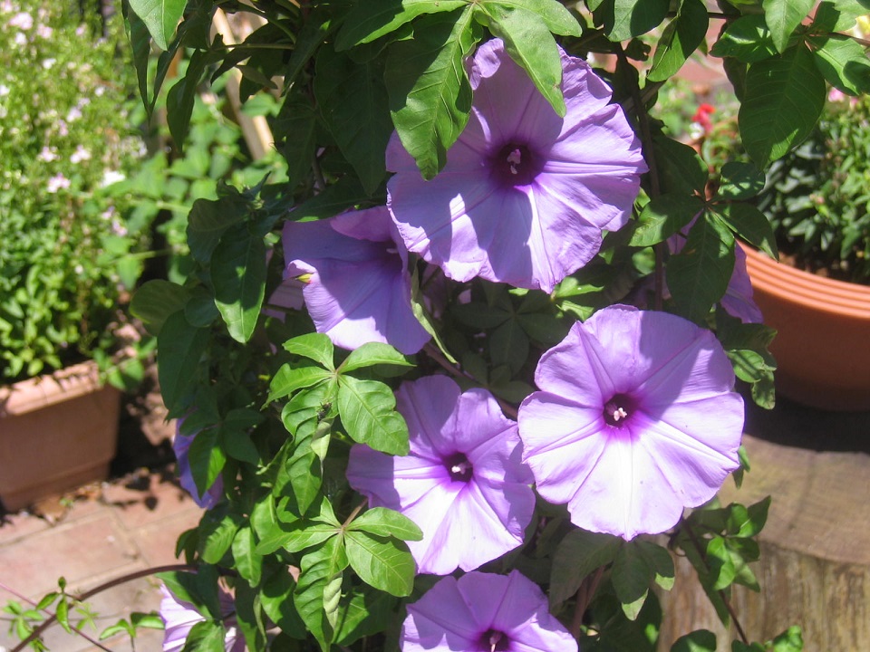 ヒルガオ科・イポメア(サツマイモ属) 熱帯~亜熱帯アジア、アフリカ原産の蔓性多年草。葉がモミジのような掌状なので、このような名前となった。 花言葉=「和やかさ、絆」