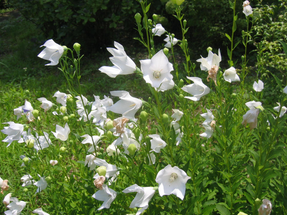 ●キキョウ(桔梗):英語名は(Balloon Flower)バルーンフラワー、(蕾が風船のように、ふっくらと膨らんでいるので)。蕾の様子は写真でも確認できます。桔梗の花色は青紫だとばかり思っていました。白い桔梗を見たのは初めてです。