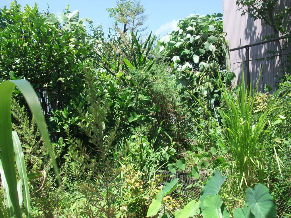 カンタンはヨモギのほかクズの葉も大好物なので庭にクズも植えたら、忽ち物凄くはびこってしまって裏庭は写真のとおりジャングルのようになってしまいました。