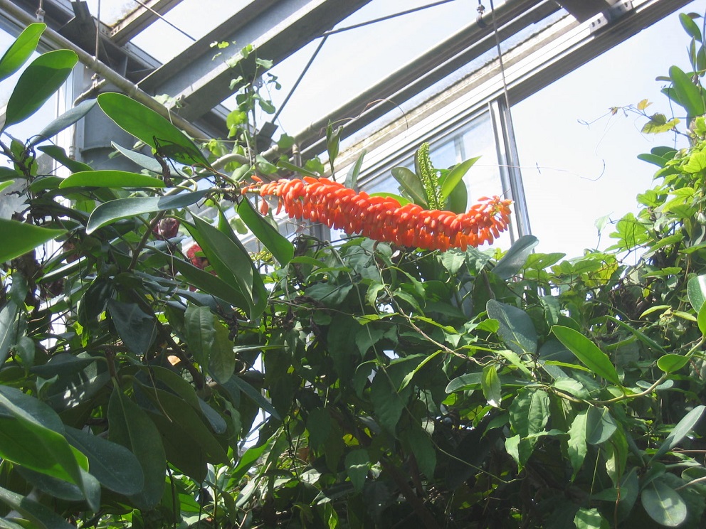 原産地は熱帯アメリカに分布。植栽場所は温室。穂になっている赤いものは、袋状の「苞(ほう)」。中に甘い蜜がいっぱい溜まっていて、それをハチドリなどが吸いにくるようです。花は苞の根元にあって、目立たないようです。