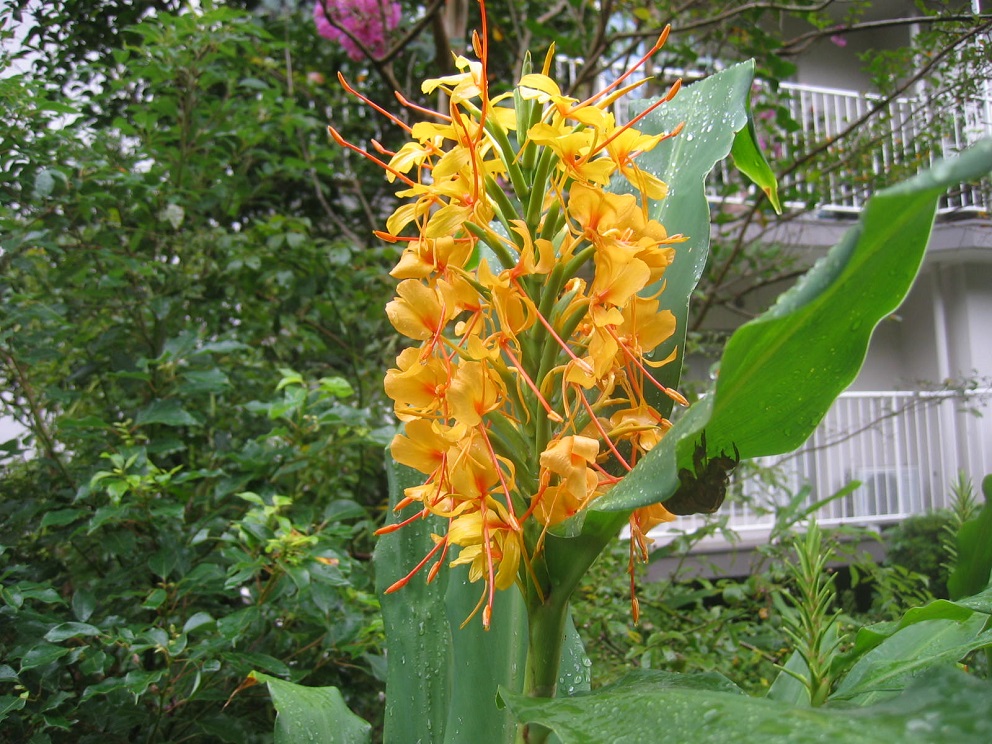 9月8日に撮影、我がグリーンハイツ内にて。我が家は3階ですが、ベランダから下を見たら何か黄色い花が沢山咲いていました。早速降りていくと立派なジンジャーの花が咲いていたので、早速撮影したというわけです。2011年11月1日号の本ブログで、町田ダリア園で撮影したジンジャーを紹介ずみですが、こんなに近くで咲いていたのには、びっくりしました。