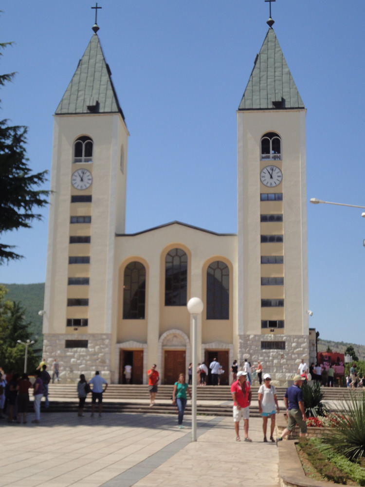 バスを降りてから、石段や坂道を下り滝壺を見物したが、壮観であった。次いでバスに乗りカトリック教徒の聖地、メジュゴーリエの教会(写真2)を訪れた。1981年6月21 日に、6人の子供達がマリア様を目撃したとされ、以後多くの巡礼者が訪れている。