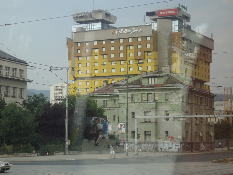 モスタルからバスに3 時間30分乗り、ボスニア・ヘルツェゴビナの首都サラエボに到着した。スナイパー(狙撃兵)通りを経由して、ホテルに向かったが、ボスニア紛争時に世界中のジャーナリストが宿泊したホリデイ・イン(写真4 )を、バスの窓から撮影した。