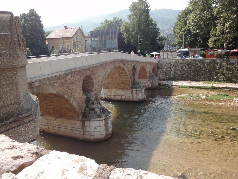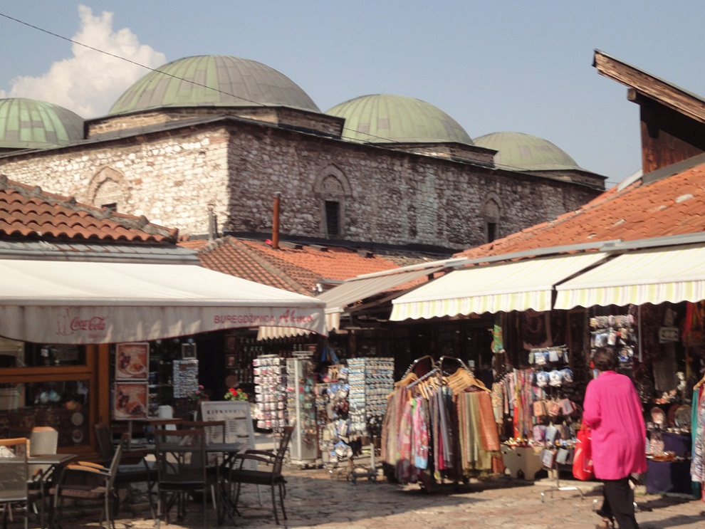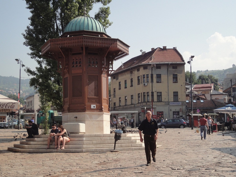 7月7日午前中は、サラエボの市内観光をした。先ず、ミリャツカ川に架かるラテン橋(写真5)でバスを下車。1914年6月28日、オーストリア=ハンガリー帝国の皇太子夫妻が、セルビア人青年に狙撃され、第一次世界大戦の発端となった場所である。昔は説明の看板が立っていたが、EU加盟のためか現在は取り除かれており、ラテン橋の手前の角にサラエボ博物館がある。ここから徒歩で北東に進み、旧市街の中心にある水飲み場セビリ(写真6 )があるパシチャルシァ広場に向かった。16世紀に建てられた旧絹取引所(写真7 )ブルサ・ベジスタンは、現在歴史博物館となっているが、オスマントルコの雰囲気に満ちている。