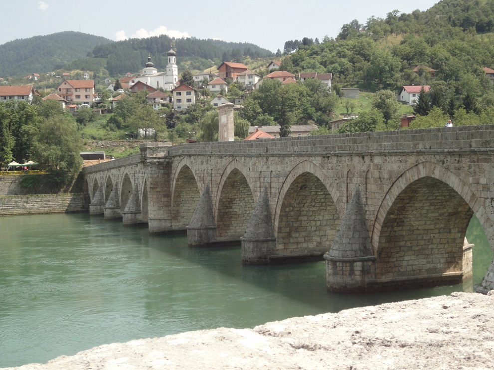 サラエボで昼食後、バスに乗って2時間でヴィシェグラードに到着した。ドリナ川沿いの町は、ボスニア出身のノーベル賞作家イヴォ・アンドリッチの傑作「ドリナの橋」の舞台で、一躍有名になった。2007年には、ドリナ川に架かるメフメット・パシャ・ソコロヴィッチ橋(写真8 )が世界遺産に登録され、観光地として一段と脚光を浴びるようになった。全長175mの橋には11のアーチがある。ドリナ川両岸の町は大変美しい。(写真9)。