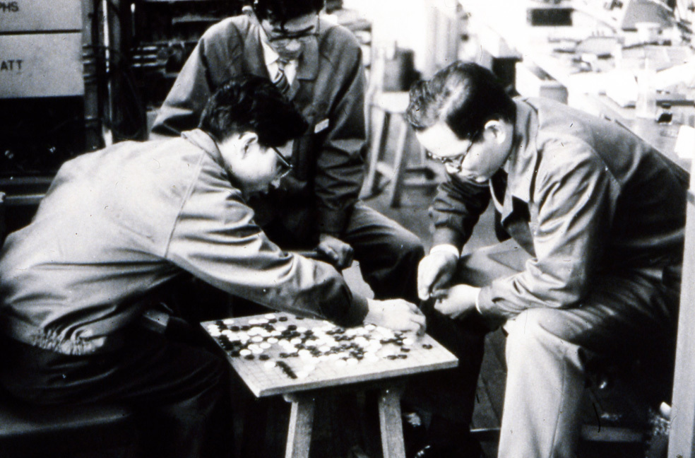 | この頃は社員が少なかったため、実験室にはピンポン台が置いてあり、昼休みには碁も打てた。K.Nさん達の観客に囲まれてH.Sさんと碁を楽しんだ。仏のS、鬼の大橋というキャッチフレーズを発明されたが、厳しい仏様であった。(写真2) | ![]() |