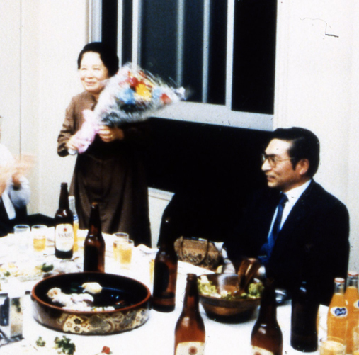 | 授賞式には家内同伴であったが、数日後の晩、H.S計画部長の企画により自宅に近いNEC高津クラブで光ケーブル通信開発本部の人達と祝賀会が行われ私の母も招かれた。母はNECに私も大分貢献しているよとよく笑っていたが、この日花束をもらって一生一度のハイライトであった。今もあの世で喜んでいると思う。(写真4) | ![]() |